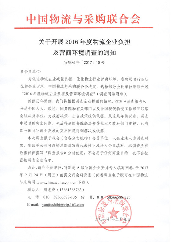 關於開展2016年度物流企業負擔及營商環境調查的通知