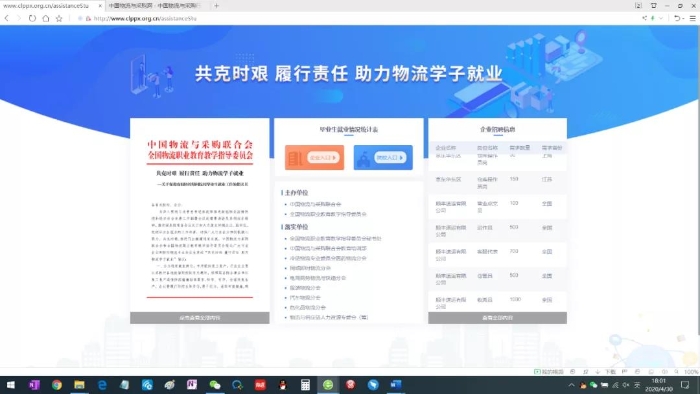 為(wei) 配合抗疫期間校企就業(ye) 對接工作,华体会登录界面、物流行指委在官網(www.clpp.org.cn)開通了“抗疫校企就業(ye) 對接平台”,充分利用各專(zhuan) 委會(hui) 的會(hui) 員平台匯總收集企業(ye) 招聘信息,目前已經匯總數千個(ge) 就業(ye) 崗位,發布到“抗疫校企就業(ye) 對接平台”。