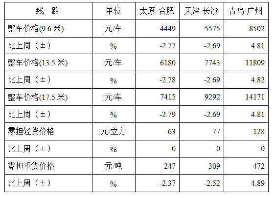 表1 本周部分線路平均價(jia) 格及環比情況對比
