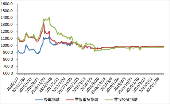 分車型看,各車型指數環比漲跌互現。其中,整車指數為(wei) 989.50點,比上周回落0.09%;零擔輕貨指數為(wei) 968.98點,比上周回升0.02%;零擔重貨指數為(wei) 989.29點,比上周回落0.10%。