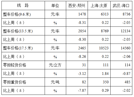 分車型看,各車型指數環比有不同程度回落。其中,整車指數為(wei) 978.99點,比上周回落1.46%;零擔輕貨指數為(wei) 951.99點,比上周回落1.75%;零擔重貨指數為(wei) 980.17點,比上周回落1.18%。