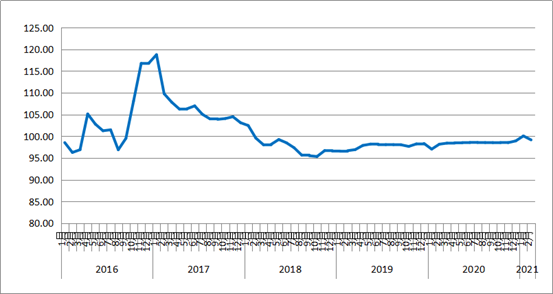 圖1 2016年以來各月中國公路物流運價(jia) 指數