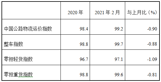 表1 2021年2月中國公路物流運價(jia) 指數表