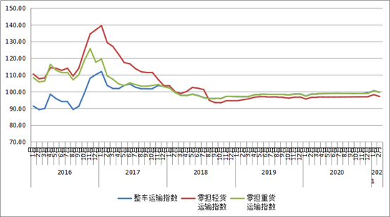 圖2 2016年以來各月中國公路物流運價(jia) 分車型指數