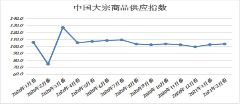 2020年2月份,大宗商品供應指數為(wei) 103.4%,指數兩(liang) 連升至近四個(ge) 月的高點,顯示今年受各地紛紛提倡“就地過年”以及生產(chan) 利潤回升的影響,企業(ye) 生產(chan) 熱情持續高漲,且對節後開工、複工預期樂(le) 觀,商品產(chan) 量居高不下,整體(ti) 供應量持續增加。各主要商品中,除汽車受產(chan) 量減少影響有所下降外,其餘(yu) 品種供應量均呈現增長態勢。