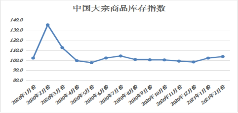 2021年2月份,大宗商品庫存指數兩(liang) 連升至近七個(ge) 月以來的最高,為(wei) 103.7%,較上月上升1.5個(ge) 百分點,顯示當前國內(nei) 大宗商品市場供需失衡進一步加劇,整體(ti) 庫存仍在積壓,商品去庫存的難度較高。各主要商品中,除汽車庫存量有所減少外,其餘(yu) 品種均有所增長。