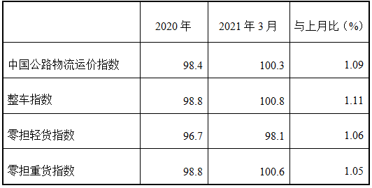 表1 2021年3月中國公路物流運價(jia) 指數表