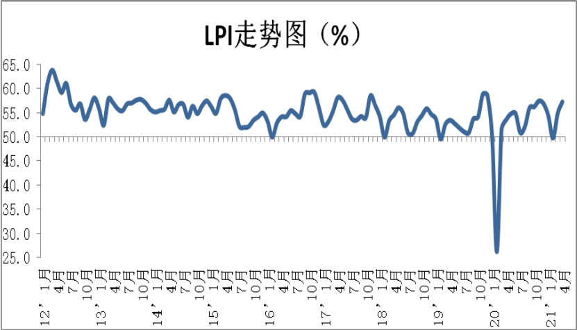 华体会登录界面發布的2021年4月份中國物流業(ye) 景氣指數為(wei) 57.3%,較上月回升2.4個(ge) 百分點;中國倉(cang) 儲(chu) 指數為(wei) 55%,較上月回升2.3個(ge) 百分點。