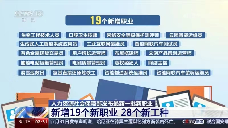 為(wei) 健全符合我國國情的現代職業(ye) 分類體(ti) 係,大力發展新業(ye) 態、新模式,開發新的就業(ye) 增長點,2019年人力資源社會(hui) 保障部建立完善新職業(ye) 信息發布製度,實施職業(ye) 分類動態調整,此後每年發布1至2批新職業(ye) 信息。2022年,修訂頒布《中華人民共和國職業(ye) 分類大典(2022年版)》。為(wei) 及時反映職業(ye) 發展變化和趨勢,2023年10月,人力資源社會(hui) 保障部發布通告,向社會(hui) 公開征集新職業(ye) 信息。經有關(guan) 機構和單位申報建議、專(zhuan) 家評審論證、書(shu) 麵征求中央和國家機關(guan) 有關(guan) 部門意見等程序,今年5月,麵向社會(hui) 公示征求意見。日前,在吸收采納各方意見建議的基礎上,人力資源社會(hui) 保障部會(hui) 同國家市場監督管理總局、國家統計局向社會(hui) 正式發布了生物工程技術人員等19個(ge) 新職業(ye) 和大件物流員等28個(ge) 新工種信息,並調整變更了11個(ge) 職業(ye) (工種)信息。此前,從(cong) 2019年到2022年,人力資源社會(hui) 保障部已陸續發布了5批共74個(ge) 新職業(ye) 。