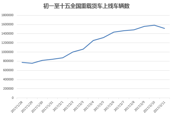 而在元宵團圓佳節當天,重載貨車上線數略有下降,但依然維持在150萬輛的較高水平。預計元宵節後,重載貨車運營數量將繼續增加,全國重要道路車流量將迎來高峰。