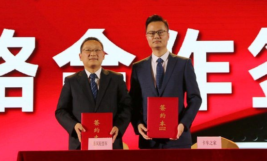 卡車之家CEO邵震先生(右)與(yu) 東(dong) 風輕型商用車營銷公司總經理邱曉軍(jun) 先生(左)簽訂戰略合作協議