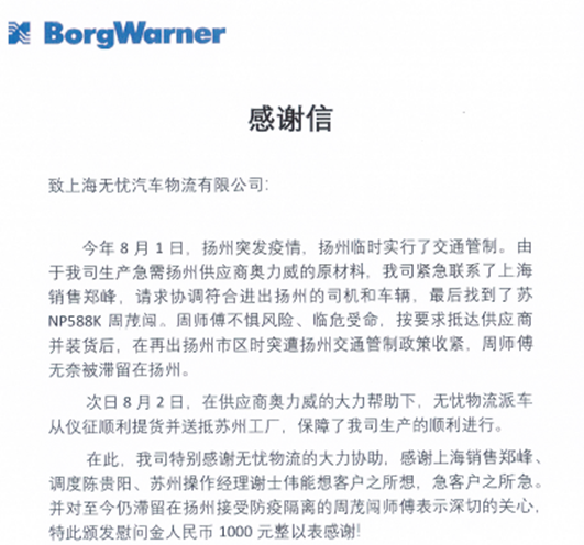 2# 8月初,揚州突發疫情,我們(men) 的客戶德爾福科技(蘇州)有限公司(現博格華納)急需符合進出揚州通行條件的司機和車輛前往揚州供應商處提貨。接到指令後,無憂的服務團隊時刻關(guan) 注當地防疫政策變化,與(yu) 客戶及原材料供應商積極溝通,最終采取通過有通行證的車輛,將貨物送至低風險的揚州下級縣城,無憂派車接應的方案。方案確定後,無憂運營團隊高效響應,安排車輛無縫對接,將貨物順利送至德爾福蘇州工廠,保障了客戶工廠產(chan) 線的順利運行。對於(yu) 無憂團隊想客戶之所想,急客戶之所急的高效服務,為(wei) 表達對我們(men) 工作的肯定和感謝,德爾福科技公司向無憂發出了誠摯的感謝。