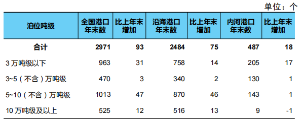 年末全國港口生產(chan) 用碼頭泊位22219個(ge) ,比上年末增加196個(ge) 。其中,內(nei) 河港口生產(chan) 用碼頭泊位16489個(ge) 、增加56個(ge) ,沿海港口生產(chan) 用碼頭泊位5730個(ge) 、增加140個(ge) 。