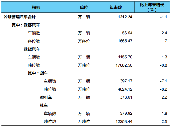 年末全國擁有公路營運汽車1212.24萬(wan) 輛。分結構看,擁有載客汽車56.54萬(wan) 輛、1665.47萬(wan) 客位,比上年末分別增加1.30萬(wan) 輛、27.18萬(wan) 客位;擁有載貨汽車1155.70萬(wan) 輛、17082.56萬(wan) 噸位,分別減少15.27萬(wan) 輛、134.15萬(wan) 噸位,其中,普通貨車325.15萬(wan) 輛、4037.73萬(wan) 噸位,分別減少33.55萬(wan) 輛、396.78萬(wan) 噸位,專(zhuan) 用貨車72.02萬(wan) 輛、786.39萬(wan) 噸位,分別增加3.33萬(wan) 輛、減少31.35萬(wan) 噸位,牽引車378.61萬(wan) 輛、增加8.23萬(wan) 輛,掛車379.92萬(wan) 輛、增加6.72萬(wan) 輛。
